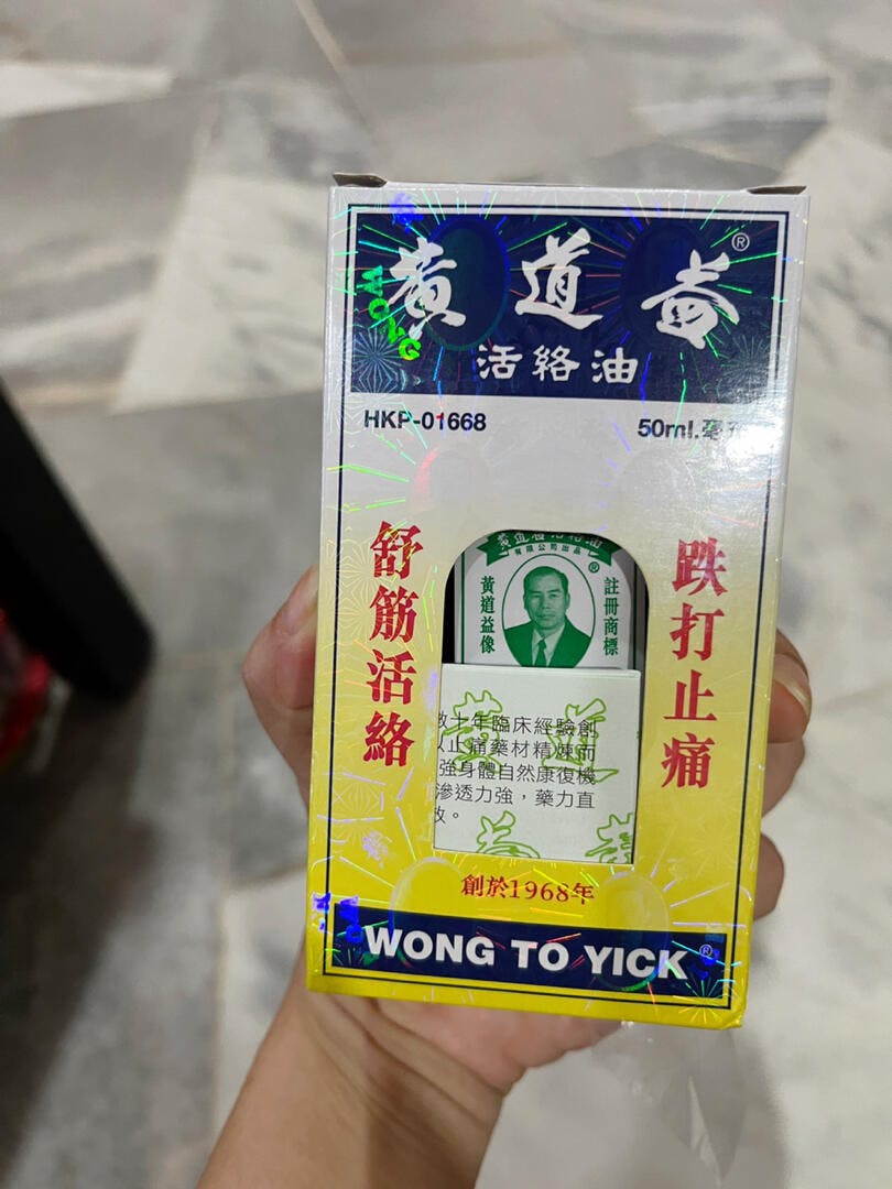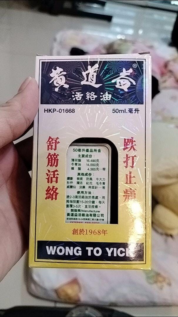 استخدم هذا الزيت العشبي الصيني الطبي (黄道益活络油) لتخفيف مؤقت للآلام والأوجاع الطفيفة في العضلات والمفاصل الناتجة عن آلام الظهر البسيطة، والتهاب المفاصل، والإجهاد، والكدمات، والالتواءات. لتخفيف مؤقت للأوجاع والآلام الطفيفة في العضلات والمفاصل الناتجة عن: -آلام الظهر البسيطة - التهاب المفاصل -الإجهاد -الكدمات - الالتواءات. صُنع بواسطة Wong To Yick Wood Lock Ointment Limited منتج من هونغ كونغ تحذيرات للاستخدام الخارجي فقط. لا تستخدم على الجروح أو على الجلد التالف إلا حسب التوجيهات، فقد يكون هذا الاستخدام خطيرًا. عند استخدام هذا المنتج، لا تقم بالضمادة بإحكام وتجنب ملامسة العينين أو الأغشية المخاطية. توقف عن الاستخدام واستشر الطبيب إذا ساءت الحالة، أو استمرت الأعراض لأكثر من 7 أيام، أو اختفت الأعراض وعادت مرة أخرى في غضون أيام قليلة.يحفظ بعيداً عن متناول الأطفال. في حال الابتلاع، احصل على مساعدة طبية أو اتصل بمركز مكافحة السموم على الفور.