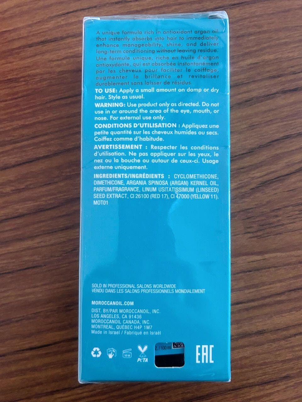 Moroccanoil Oil Treatment for Hair er et ultralet serum, der øjeblikkeligt absorberes i håret for at skabe en smuk glans og langvarig konditionering. I hundredvis af år er arganolie blevet brugt af kvinder i Marokko til at behandle hår og negle for at modvirke virkningerne af det varme klima. Argan-træet, der kun findes i det sydvestlige Marokko kaldet Argana; blomstrer under ørkenlignende forhold og producerer frugter, der ligner oliven, men er større og rundere. Inde i frugten vokser en stor nød, der huser op til tre mandelformede kerner, som er kilden til denne mirakuløse olie. • Genopliver håret • Styrker og plejer • Reducerer tørretiden Sådan bruges: Efter shampoo og balsam, start med en lille mængde i håndfladen og arbejd det igennem fugtigt hår. Style som sædvanligt. Påfør et par dråber så ofte som nødvendigt for at opnå blødt, skinnende hår. Før farvning masseres ca. 5 ml Moroccanoil Treatment ind i håret. Dette vil forbedre hårets evne til at absorbere farven. Ingredienser: Cyclopentasiloxane, Dimethicone, Cyclomethicone, Butylphenyl Methyl Propional, Argania Spinoza Kernel Oil (Arganolie), Linseed (Linum Usitatissimum) Extract, Fragrance Supplement, D&C Yellow-11, D&C Red-17, Coumarin, Benzyl Benzoate, Alpha-Isomethyl Ionone.